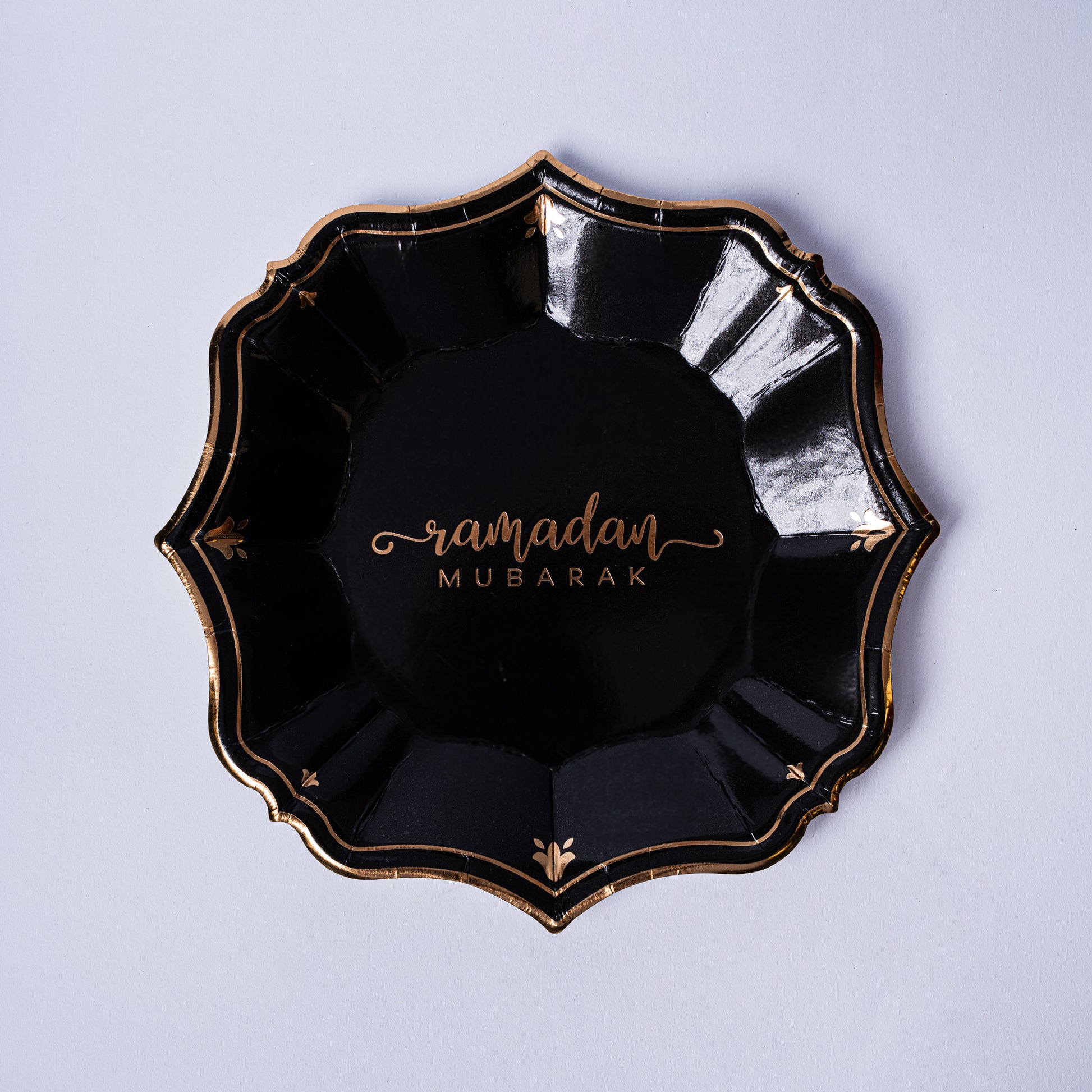 Make your celebration extra special with these stunning black and gold “Ramadan Mubarak” plates. The elegant gold lettering on a glossy black background creates a luxurious and modern look.